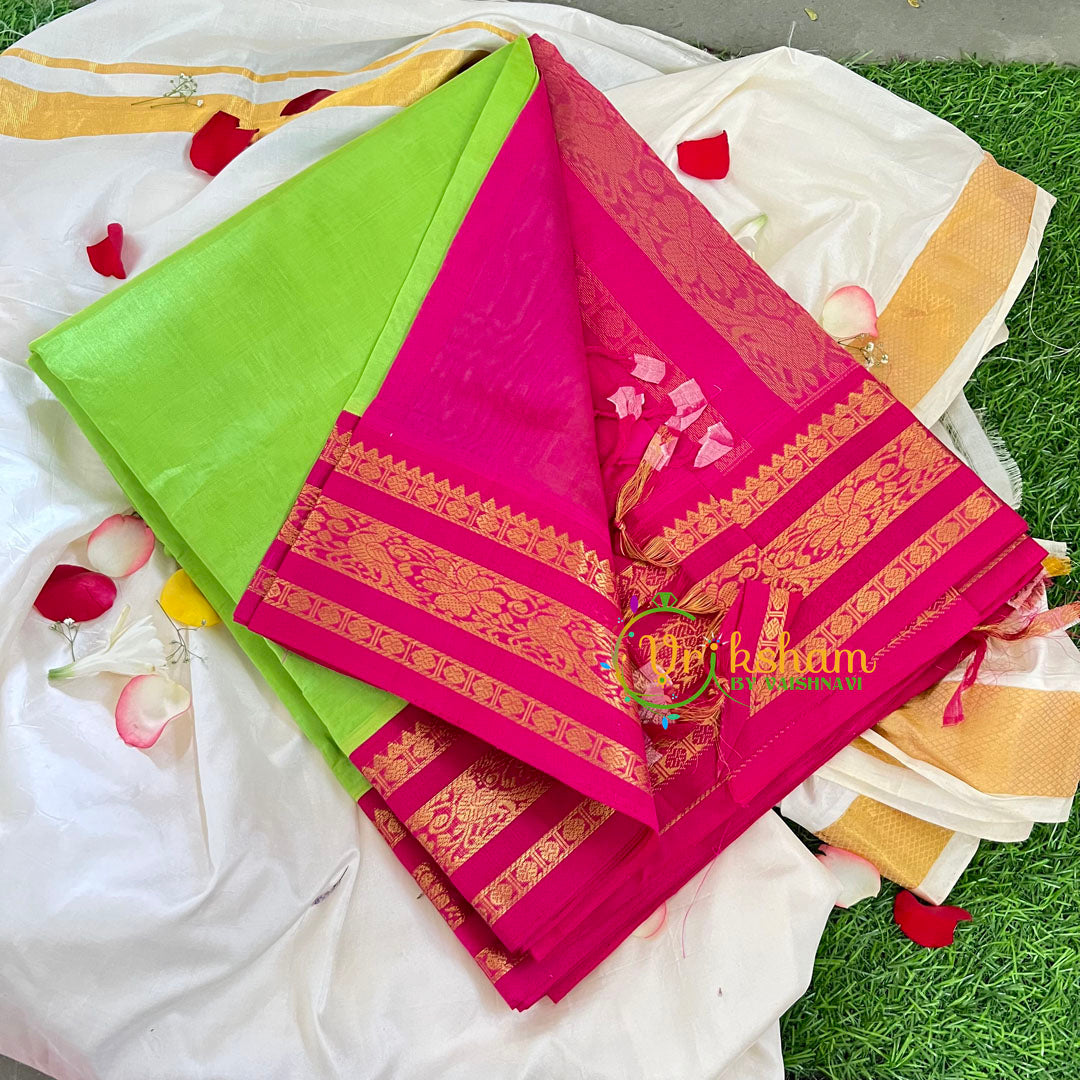 Parrot Green with Pink Korvai Handloom Silk Cotton Saree-- Festive wear saree –Plain Pattern throughout the saree; comes with Blouse attached. Two side contrast border and pallu.