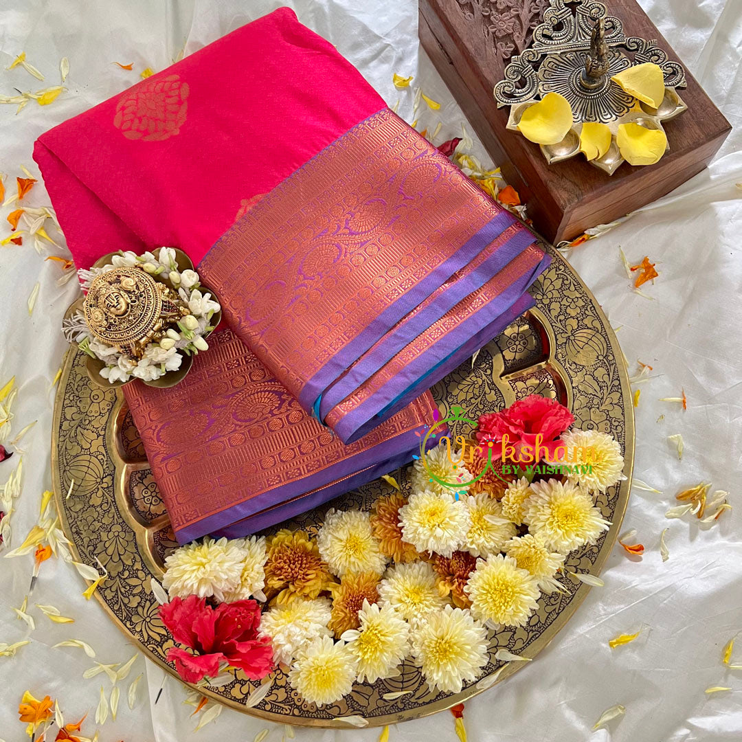 Hot Pink Kanchi Silk Saree with Lavender Border - Kanchi Silk Saree – Festive wear silk saree – saree; comes with Blouse attached. Power loomed saree.