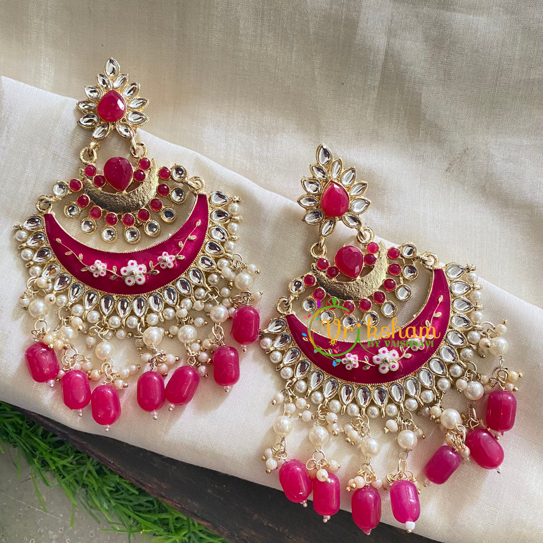 Hot Pink Meenakari Chandbali Danglers-Hand painted-two layered. Bead and Pearl finish.