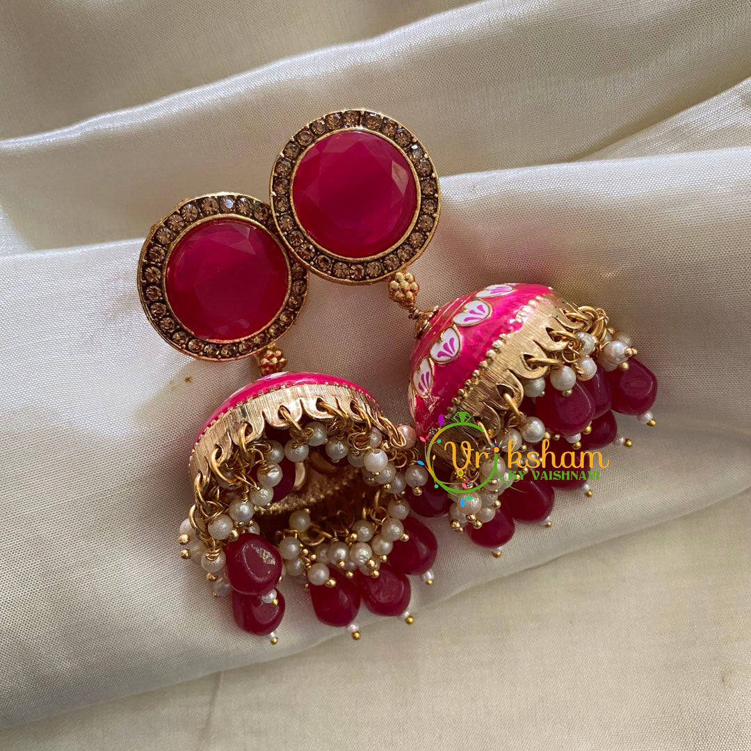 Hot Pink Meenakari Jhumkas-Hand painted-Round Stud with hand painted Jhumkas base. Bead and Pearl finish. Medium size.