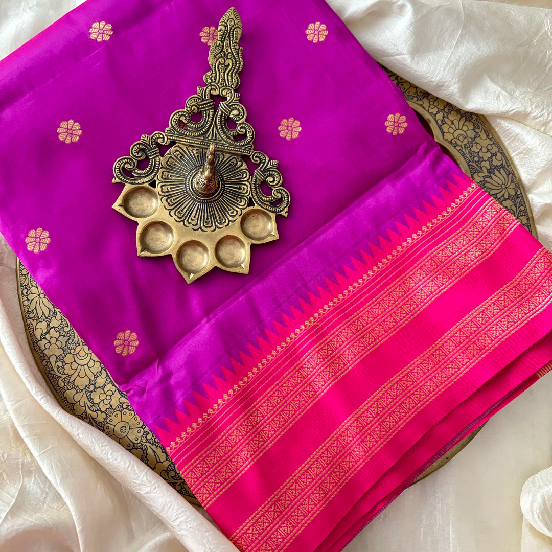 This stunning hot pink saree is sure to make a statement with its magenta pink border and intricate double golden thread work with butta all over saree. Made from luxurious paithani semi silk, this saree is perfect for any occasion, giving you a touch of elegance and style.