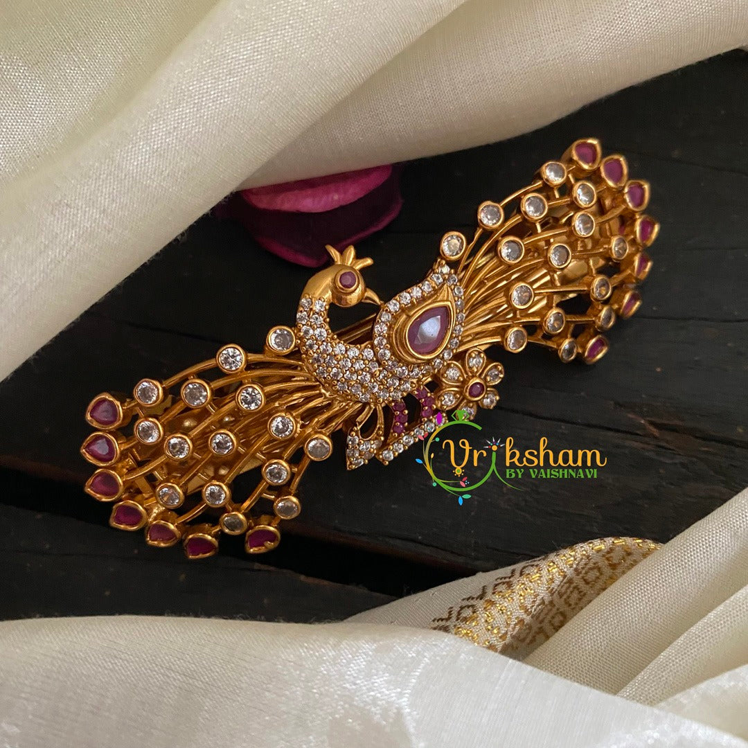 Gold Look Alike AD Stone Peacock Hair Clip-Red White– AD Stone imitation stone studded festive hair accessory.