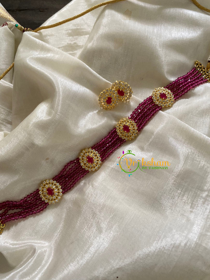 AD Stone Pendant in Pink Crystal Bead Choker –5 layers of crystal beads and red ad stone 4 pendant high neck choker; comes with matching ear studs.