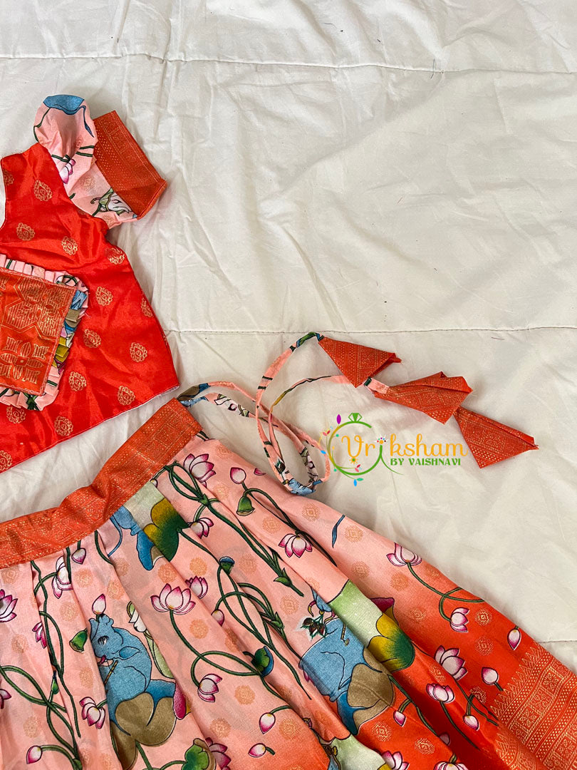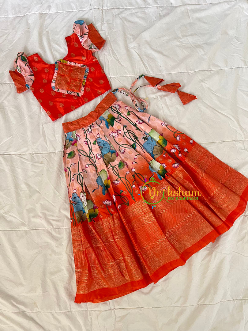 Color : Orange Pichwai print Indian Traditional Girls Lehenga.