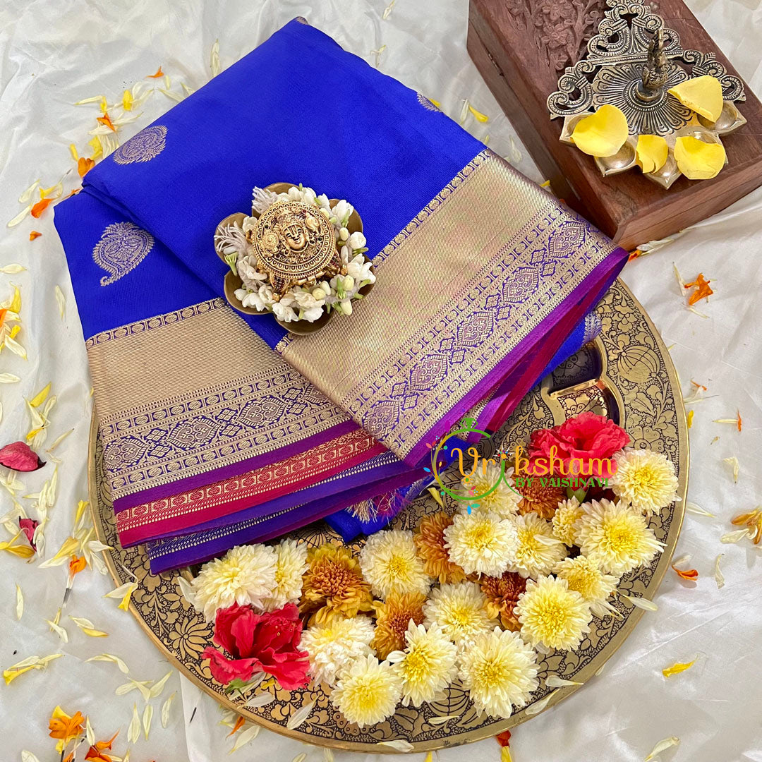 Ink Blue Kanchi Silk Saree with Violet Border -Kanchi Silk Saree – Festive wear silk saree – saree; comes with Blouse attached. Power loomed saree.