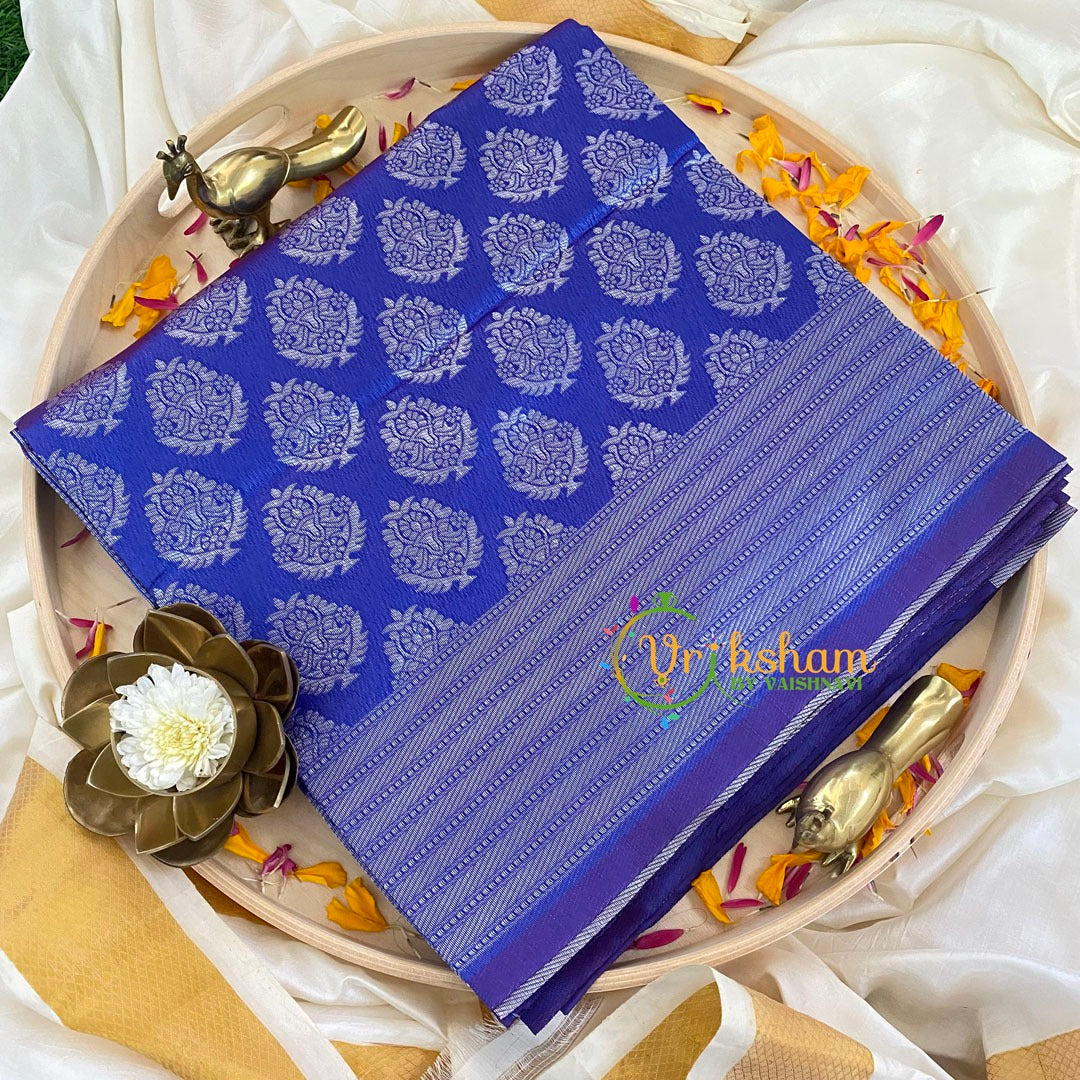 Ink Blue Litchi Silk Saree- Festive wear saree – Medium size motif pattern throughout the saree; comes with Blouse attached. White Thread work. Medium border saree.