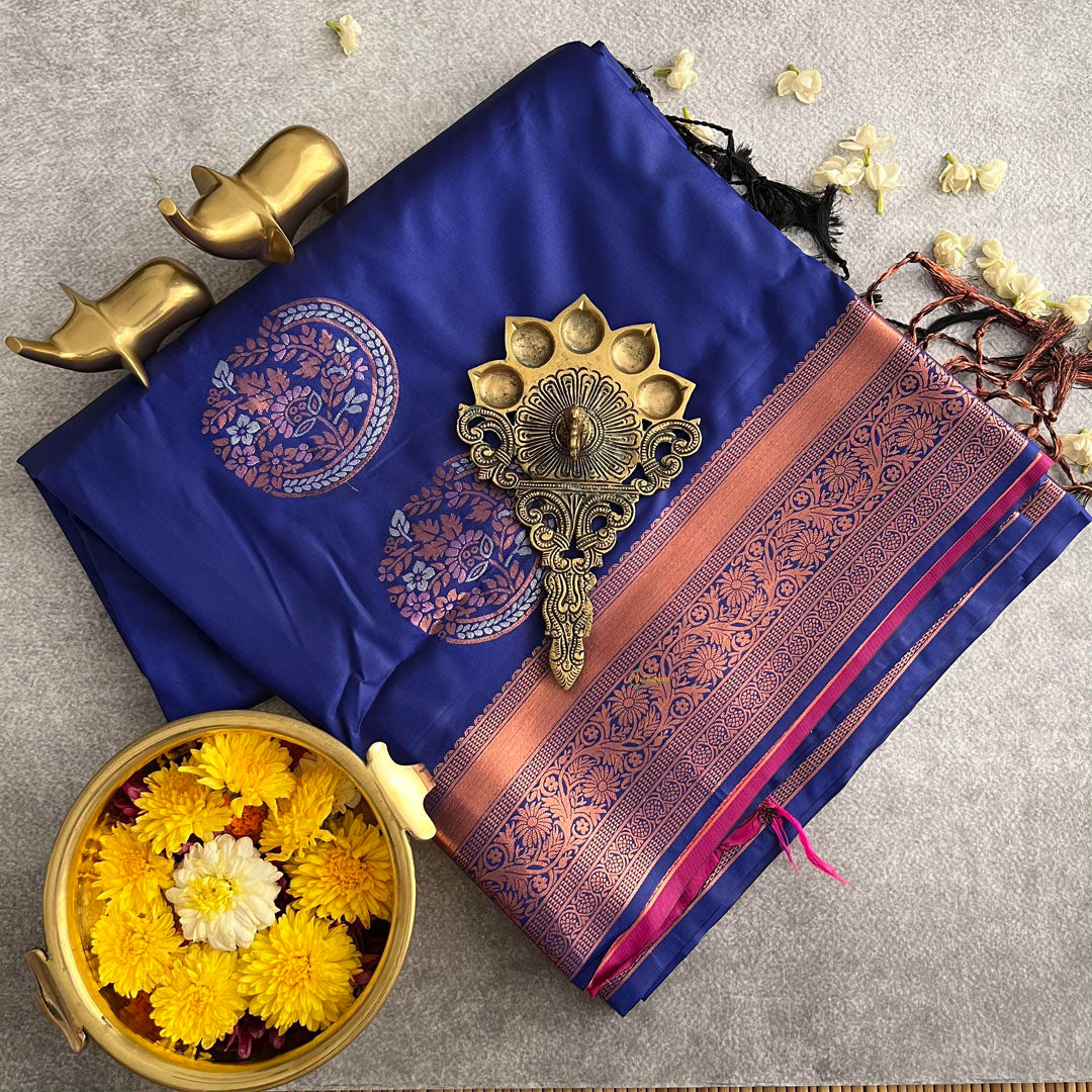 Indulge in luxury with our Ink Blue Soft Silk Saree. Made from the finest soft silk, its hot pink pallu is adorned with intricate zari work, adding a touch of sophistication and elegance to any occasion. Experience the beauty of this saree and elevate your style today.