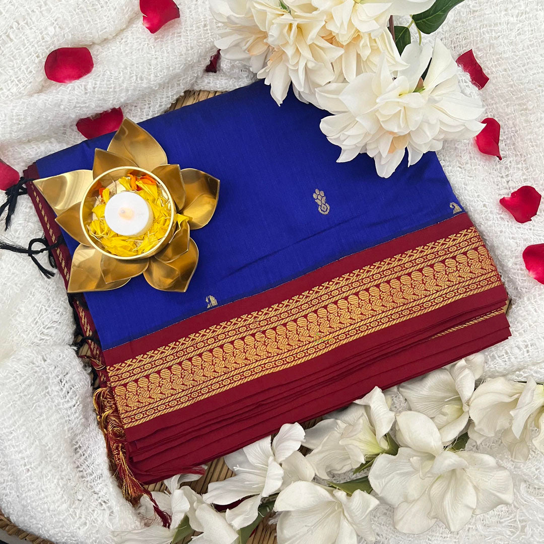 Unleash your elegance with our Ink Blue With Maroon Border - Kalyani Cotton Saree! Made from high-quality kalyani cotton, it features a beautiful contrast border that will make you stand out. The zari work on the border and delicate tassels attached to the pallu add a touch of sophistication. Elevate your saree game now!