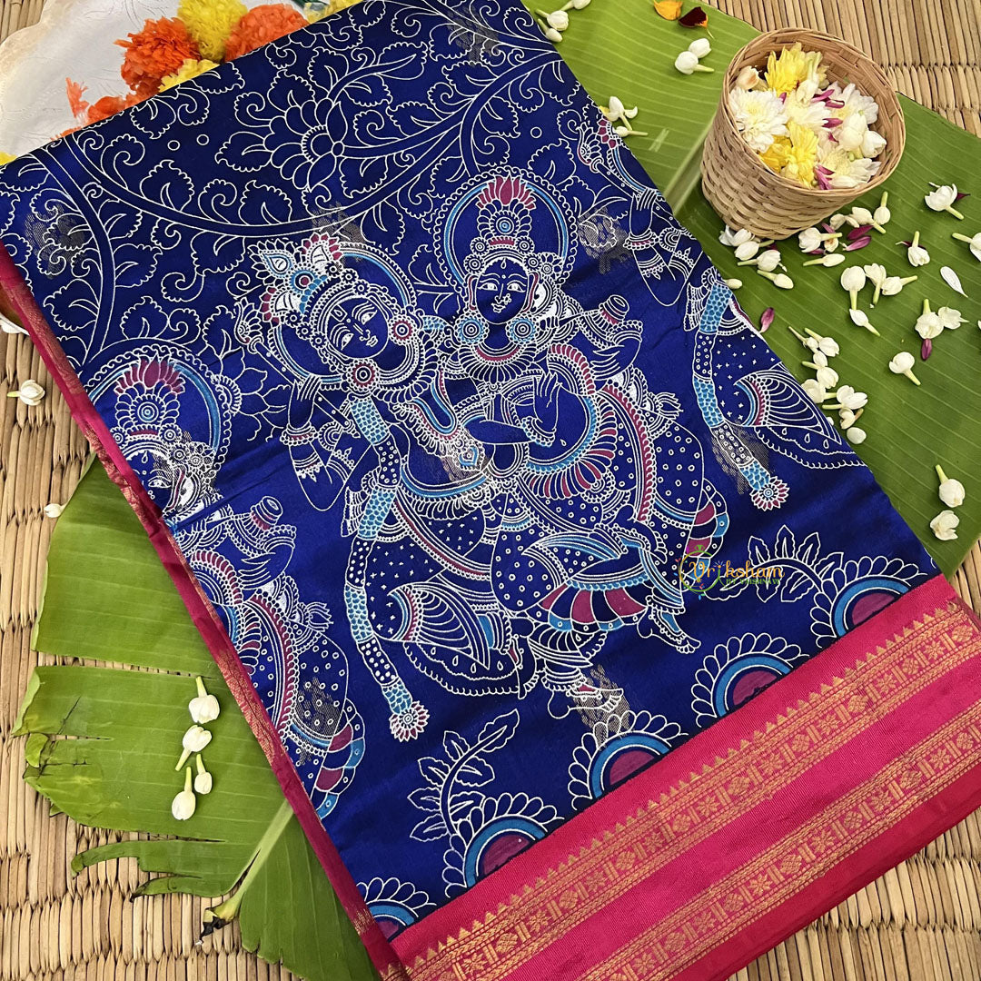 Elevate your style with our Ink Blue with Pink Border Silk Cotton Kalamkari Saree. This exquisite saree features a beautiful radha krishna print, adding a touch of elegance and sophistication. Made from premium silk cotton, it offers both comfort and luxury. Make a statement and stand out with this timeless piece.