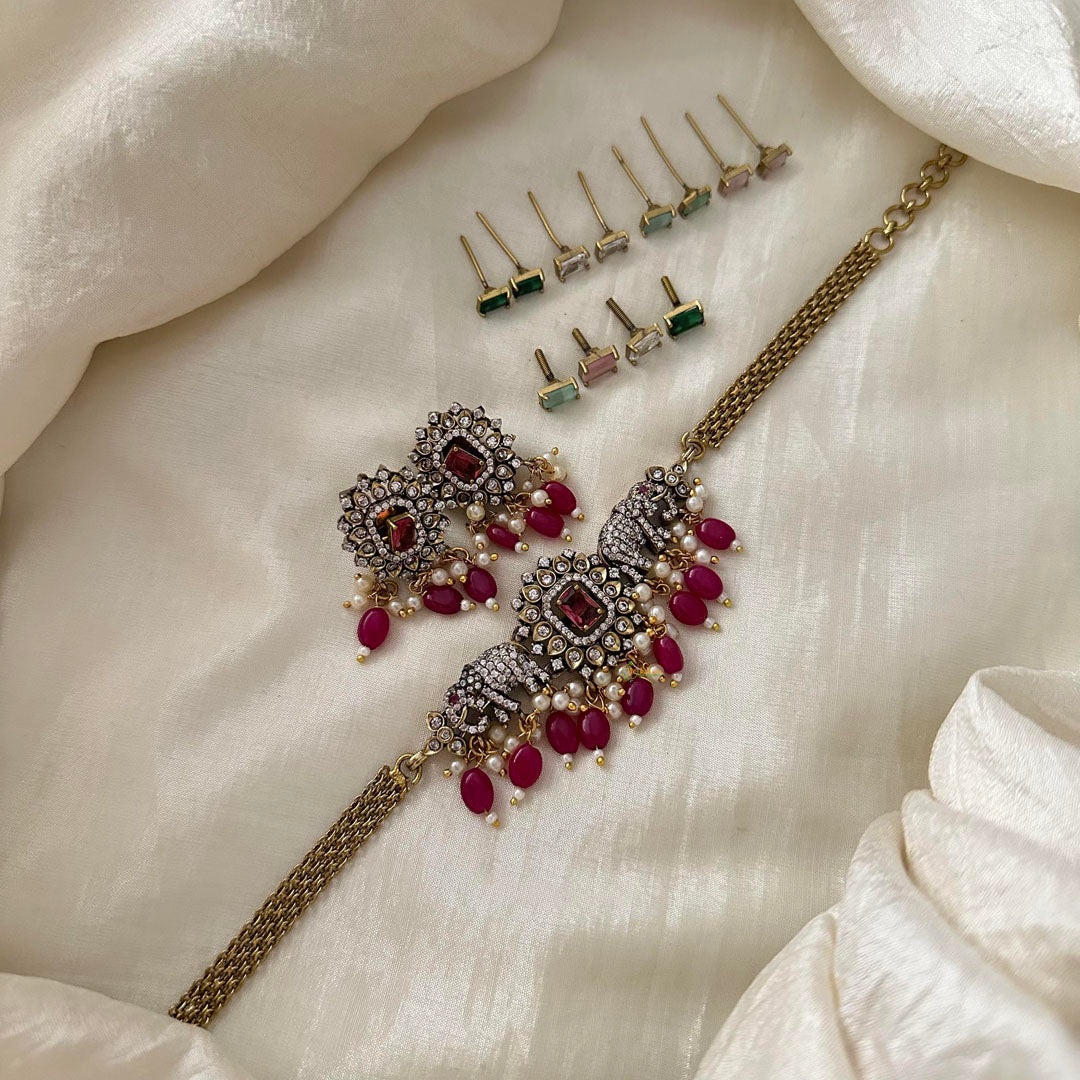 Transform your look with our Interchangable Victorian Diamond Elephant Choker. Adorned with stunning diamonds and vibrant red beads, it's the perfect statement piece. Mix and match the interchangeable elements to create a unique and elegant choker for any occasion. Elevate your style and stand out in the crowd. Comes with matching earrings.