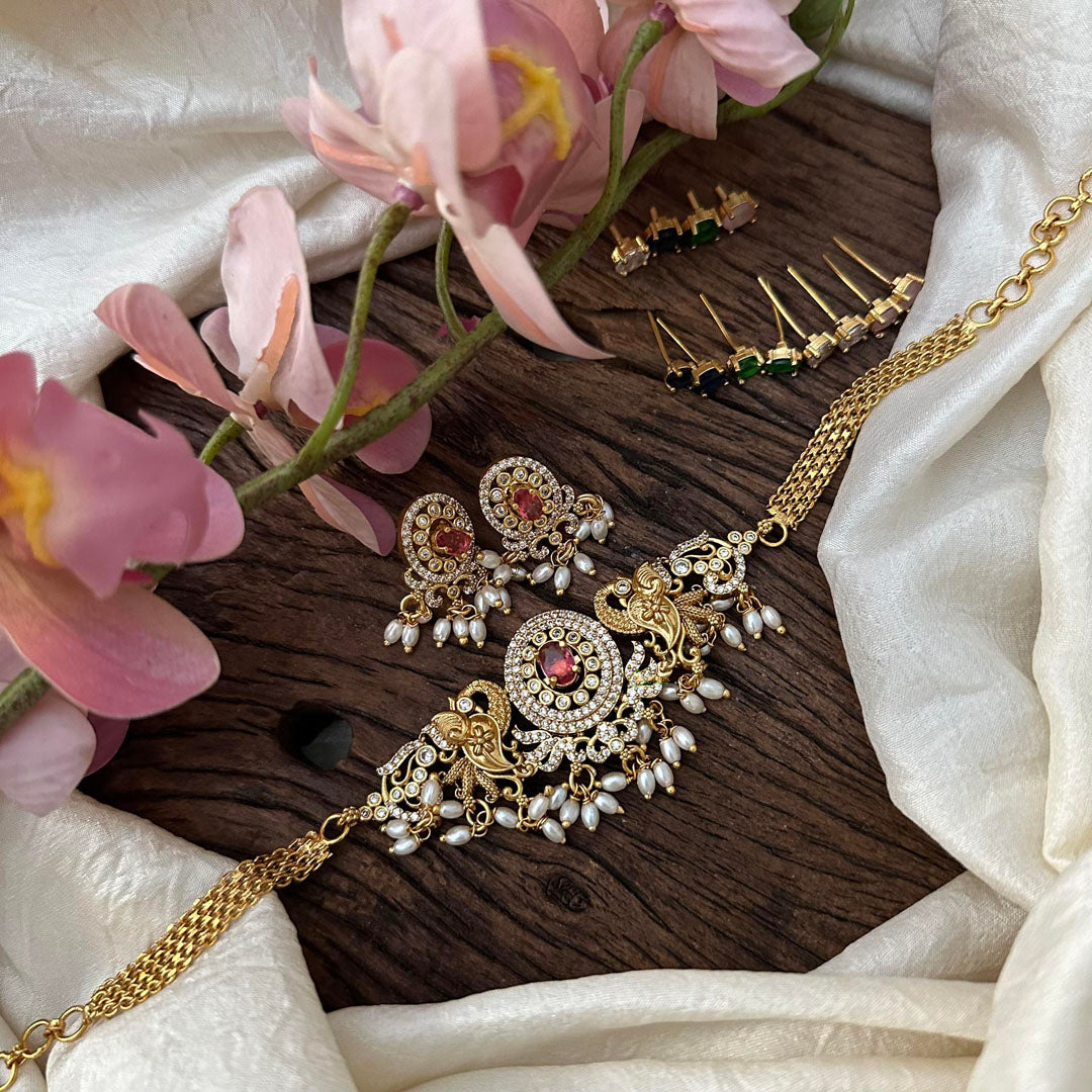Looking for a versatile accessory? Look no further! Our Interchangeable AD Stone Dual Peacock Addigai-Rice Pearls necklace offers both elegance and flexibility, allowing you to mix and match the perfect look for any occasion. With sparkling stones and lustrous pearls, this piece promises to elevate any outfit. Comes with matching earrings.