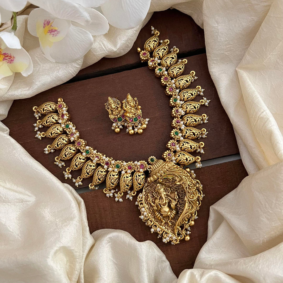 Elevate your style with the intricate design of our Ganesha neckpiece adorned with lustrous pearls. This exclusive piece combines artistry and elegance, while bringing inner peace and wisdom to your ensemble. Elevate your look with the divine energy of Ganesha and the beauty of pearls.