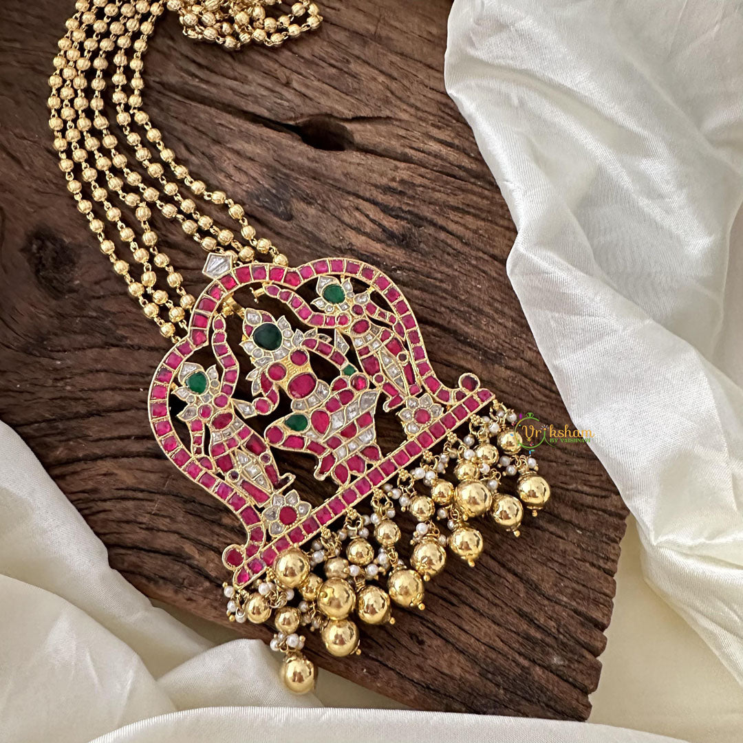 Indulge in opulence with our Intricate Lalitha Devi Jadau Kundan Pendant Haram. Handcrafted by skilled artisans, this exquisite piece features intricate details that evoke the grace of the goddess Lalitha Devi. Adorn yourself with this luxurious pendant that exudes elegance and sophistication.