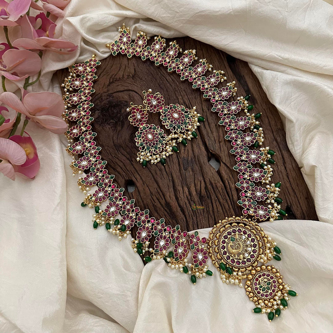This exquisite Non Idol Haram combines intricate Kemp Stone and lush green beads with shimmering pearls for a unique and elegant look. Elevate your style with this precious piece and stand out from the crowd. Perfect for any occasion, this stunning necklace is sure to impress! Comes with matching earrings.