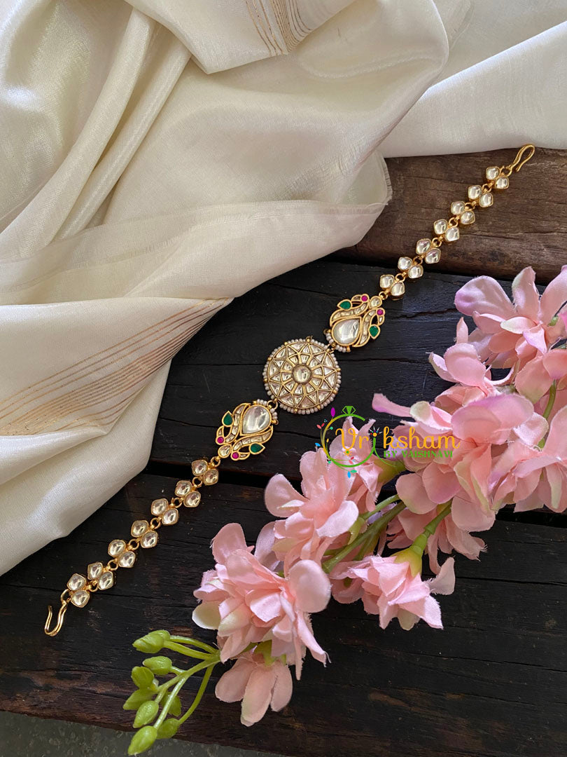 Precious Jadau Kundan Bridal Sheeshphool- white (predominantly), Green and pink kundan, thilak and dual peacock pattern -matha patti bridal hair accessory.