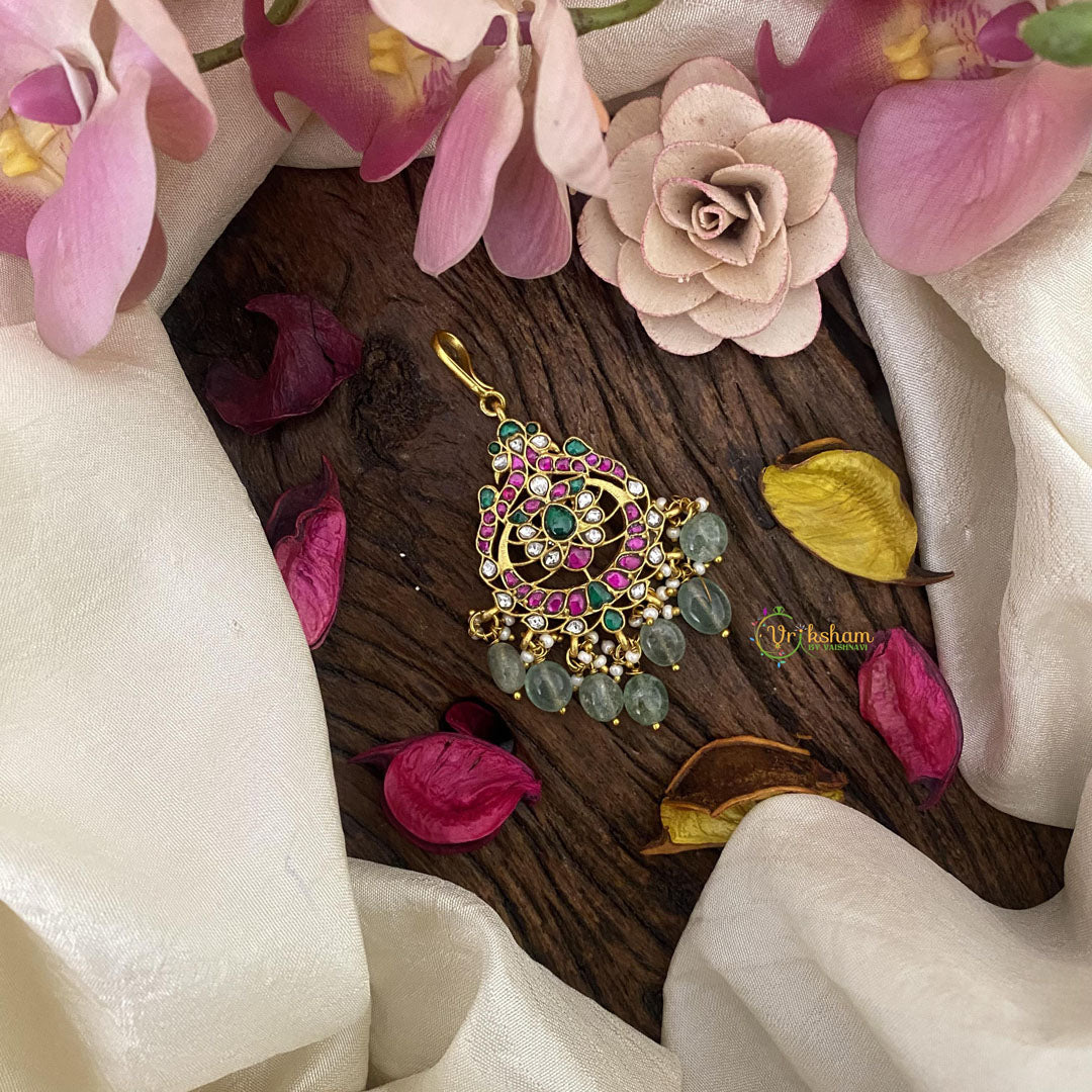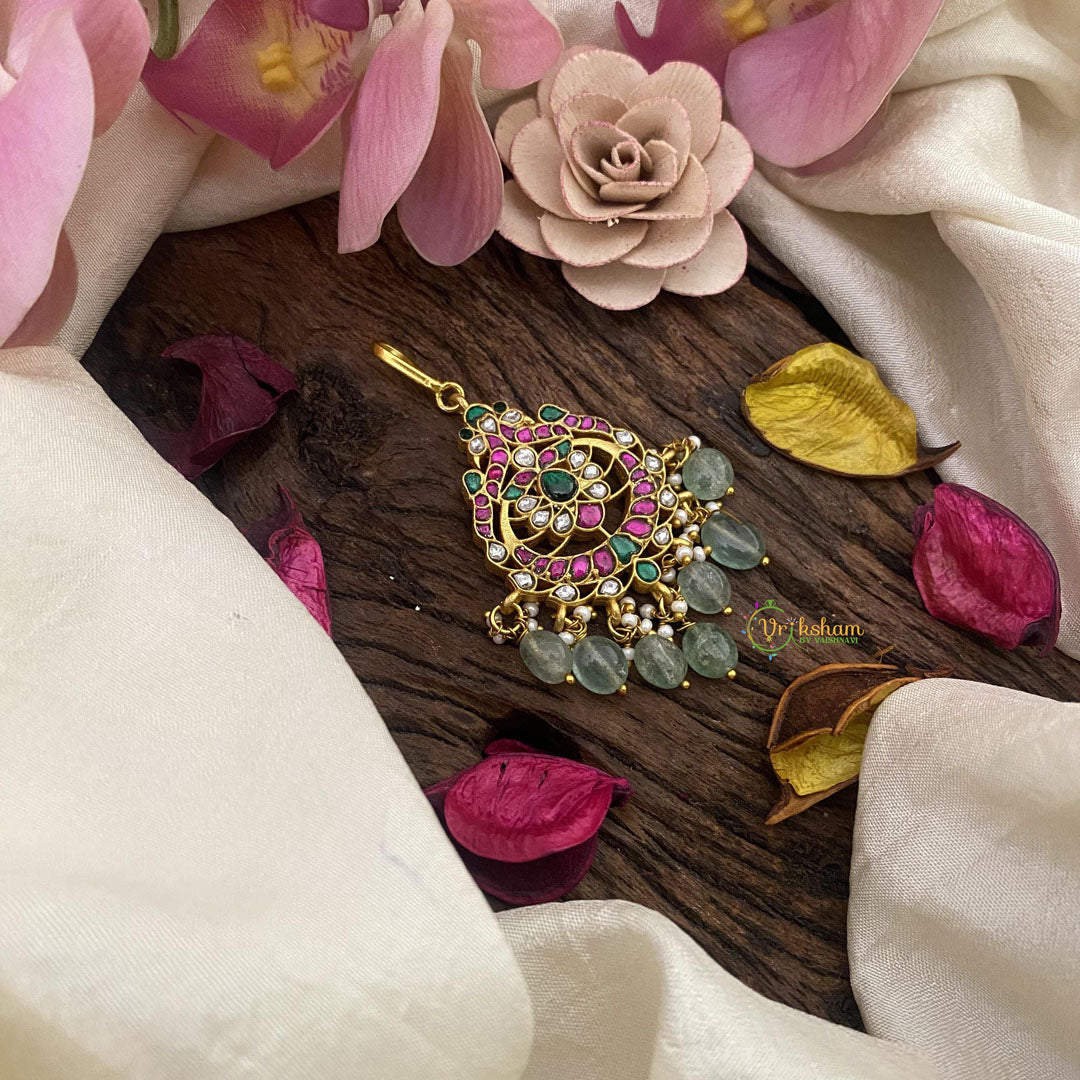Complete your elegant look with our exquisite Precious Jadau Kundan Short Maang Tikka. Handcrafted with intricate Kundan work, this luxurious piece will add a touch of sophistication to any outfit. Elevate your style with this exclusive and timeless accessory.