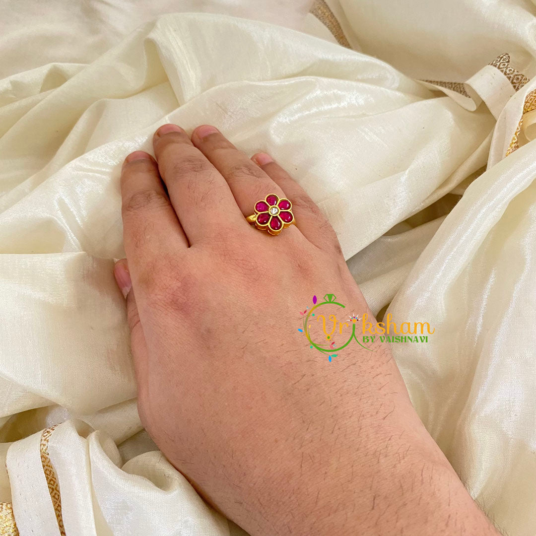 Precious Jadau Kundan Floral Finger Ring-Red White 7- Gold Look Alike polished kundan jadau finger ring.