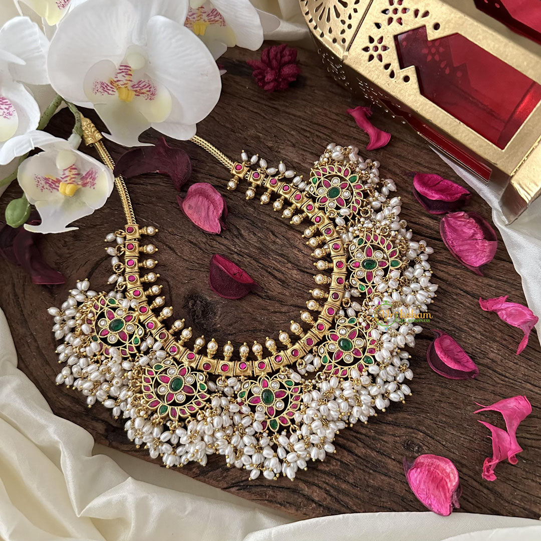 Indulge in the opulence of Jadau Kundan Floral Guttapusalu-Rice Pearl. Handcrafted with intricate detailing and adorned with the finest Kundan stones, this stunning piece exudes sophistication and grace. Elevate your look with the timeless elegance of this luxurious necklace.