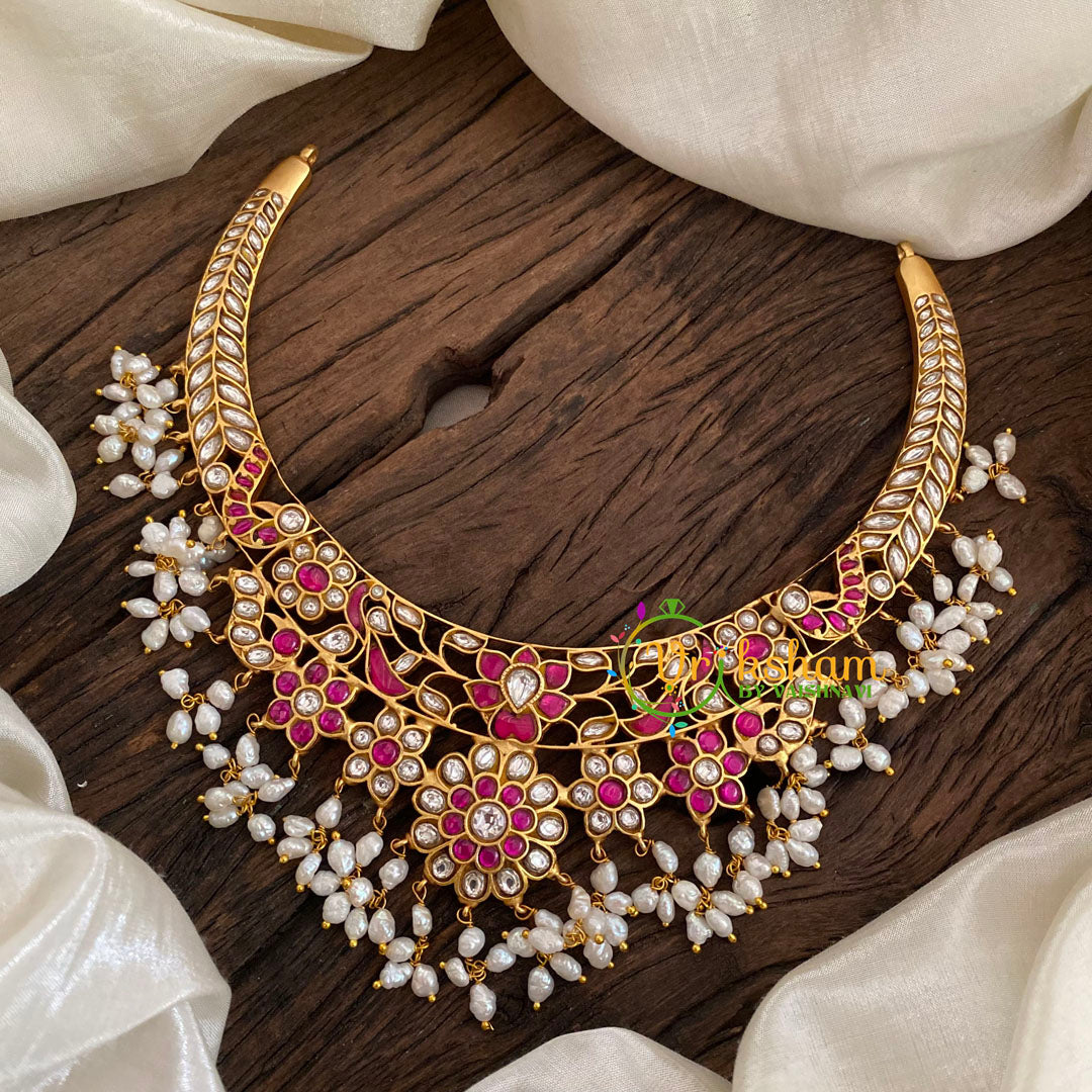 Jadau Kundan Guttapusalu Choker Short Neckpiece - semi precious kundan stones with jadau work and rice pearl finish; Neckpiece only.