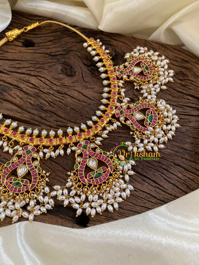 Precious Jadau Kundan Guttapusalu Neckpiece – Premium quality polish precious Pink green and white kundan jadau work; guttapusalu pearl finish.