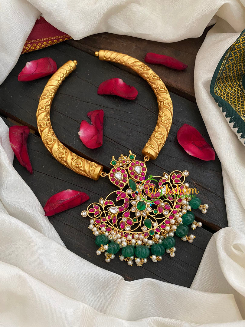 Exquisite Jadau Kundan Hasli Choker with kundan & precious stone studded premium quality GREEN BEAD AND pearl finish neckpiece.