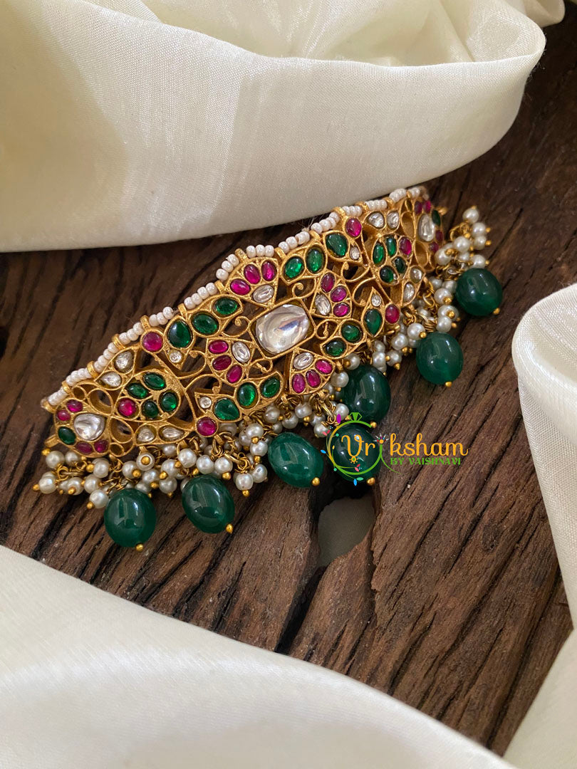 Exquisite Jadau Kundan High Neck Choker with kundan & precious stone studded premium quality green bead finish neckpiece.