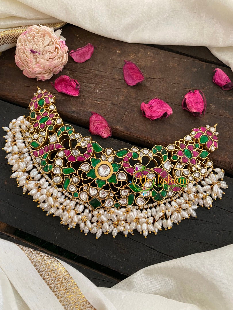 Precious Jadau Kundan High Neck Choker – Premium quality polish precious Pink green and white kundan jadau work; rice pearl finish.