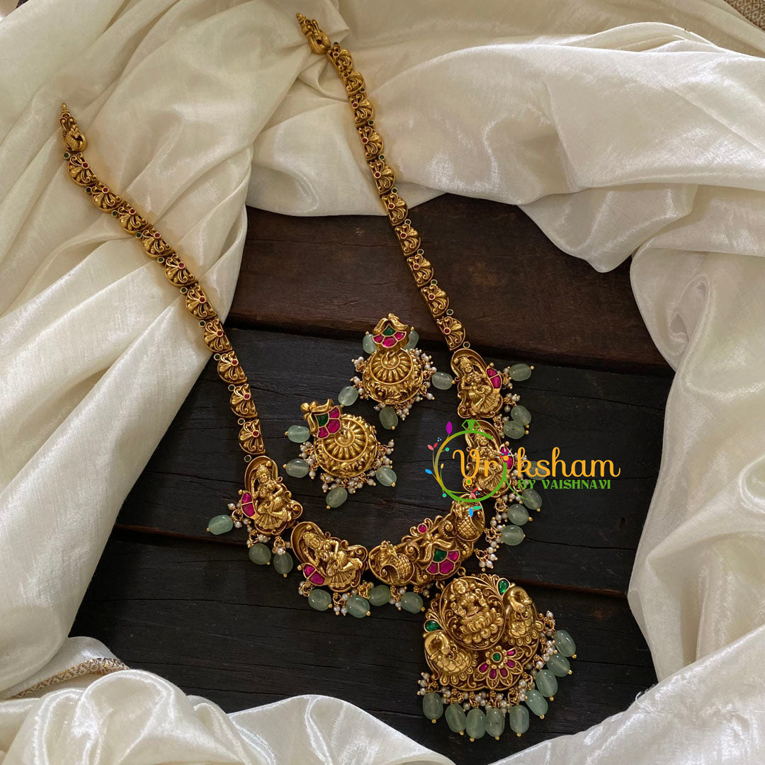 Precious Jadau Kundan Lakshmi Haram - Premium Gold Polish intricately worked with kundan & precious stone studded, pendant, premium quality neckpiece. Pastel Green bead and pearl finish.
