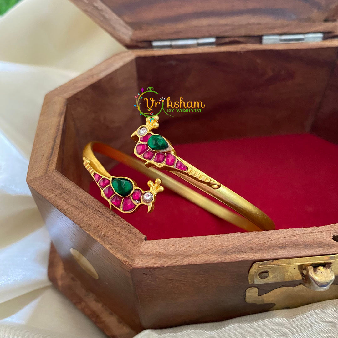 Precious Jadau Kundan Openable Kada Bangle -Spear–Kada type openable stretch open bangles with Red Green Bird shaped stone ends.