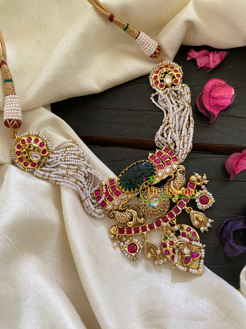 Jadau Kundan Pearl High Neck Choker - semi precious kundan stones with jadau work and multiple layers of pearl chain.