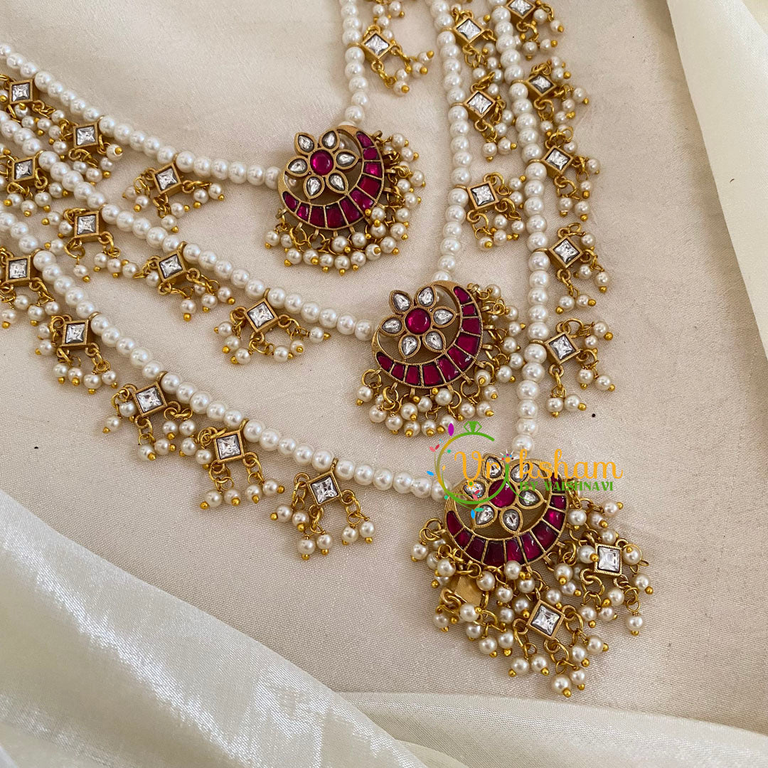 3 Layered Jadau Kundan Pearl Neckpiece- pendants- Jadau Kundan work hangings. Pearl and Green Bead Finish.