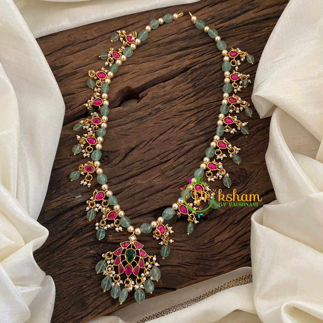 Pastel Green Bead Jadau Kundan Pendant Mala is one of our highest quality jewelry; handmade by artisans; this boasts the design and quality of a real silver.
