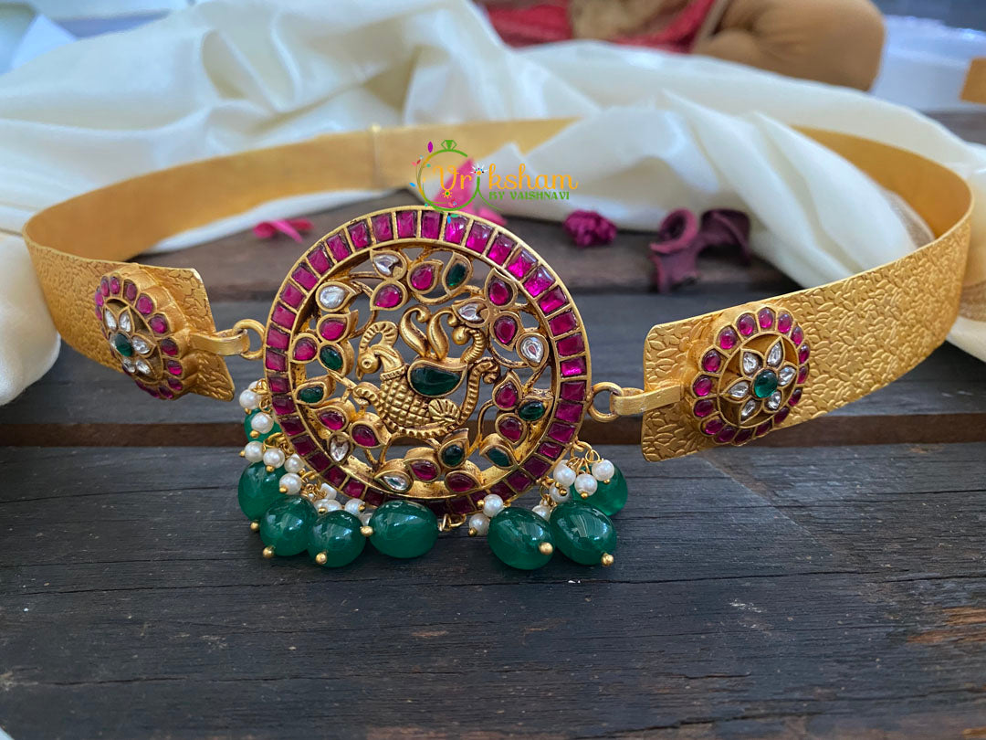 Precious Jadau Kundan Plain Hipbelt -Peacock- pearl and bead finish; embossed belt design; ADULT'S hipbelt. Green Bead finish.