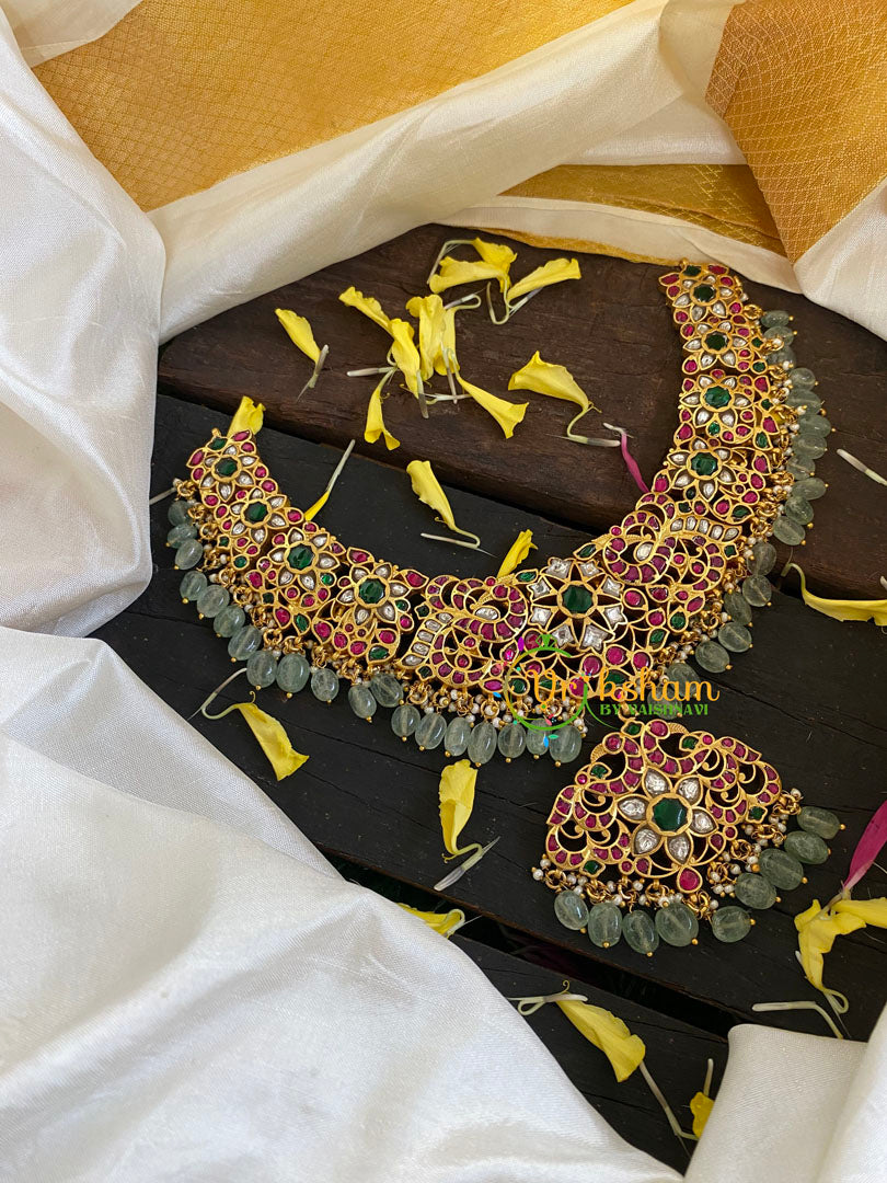 Pastel Green Bead Jadau Kundan Short Neckpiece with pendant– Premium quality polish precious Pink green and white kundan jadau work; pastel green bead finish.