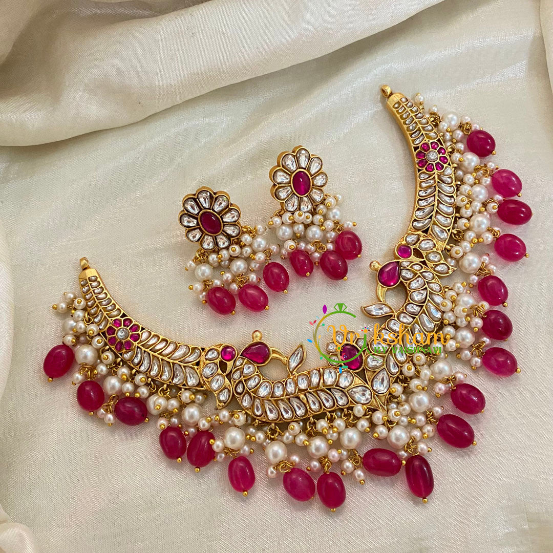 Pink and White Precious Jadau Kundan Short Neckpiece-Pinkish Red Beads - can also be worn as choker– Premium quality polish precious Pink green and white kundan jadau work.
