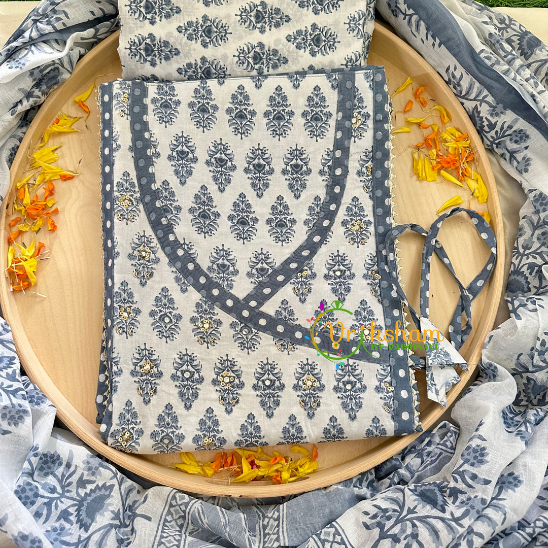 Grey Jaipur Cotton Suit Material Set -Salwar kameez material set - comes as whole material top, bottom and shawl.