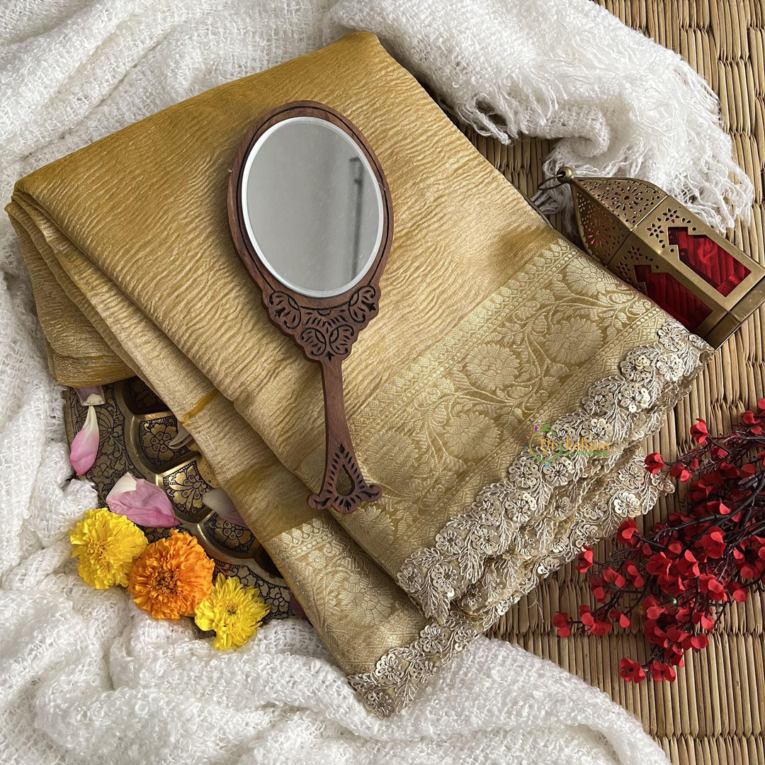 Indulge in exquisite style with our Janhvi Kapoor Golden Organza Saree. Handloom crafted to perfection, this saree exudes elegance and sophistication. The sheer organza fabric shimmers in a beautiful golden hue, while the intricate details add a touch of luxury. Elevate your wardrobe with this timeless piece.