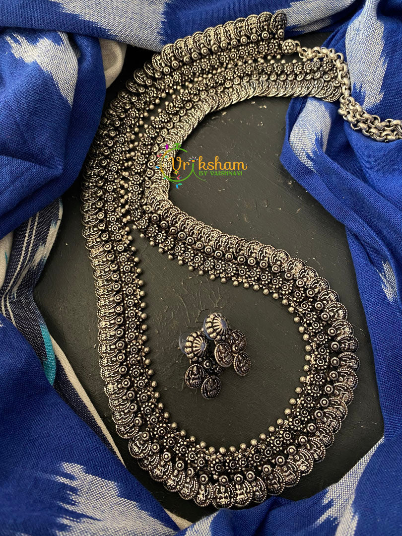 Kolhapuri Kaaumala Haram -Silver Kaasumala -Temple long neckpiece NO STONE Kolhapuri make, with lakshmi kaasumala long neckpiece.