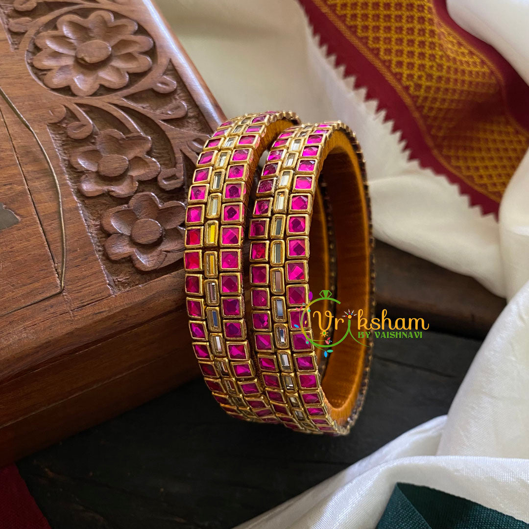 Kada Kundan Bangle-Square & Rectangle - Pink- Sandal Silk Thread Bangles- kundan stone festive bangles , Comes as 2 bangles only.