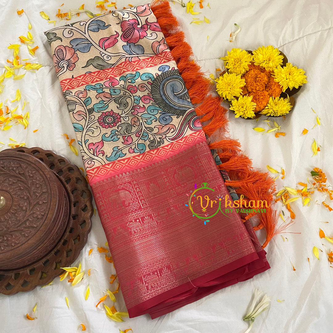 Pale Yellow Kalamkari Semi Soft Silk Saree – with traditional border – Kalamkari digital print pattern throughout the saree; comes with Blouse attached. Two side contrast border and pallu.