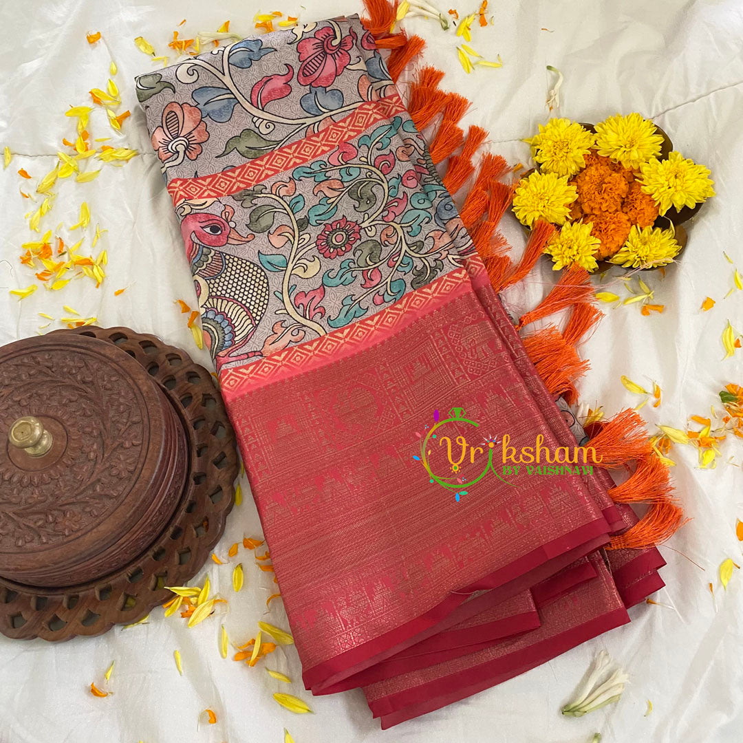 Grey Kalamkari Semi Soft Silk Saree – with traditional border – Kalamkari digital print pattern throughout the saree; comes with Blouse attached. Two side contrast border and pallu.