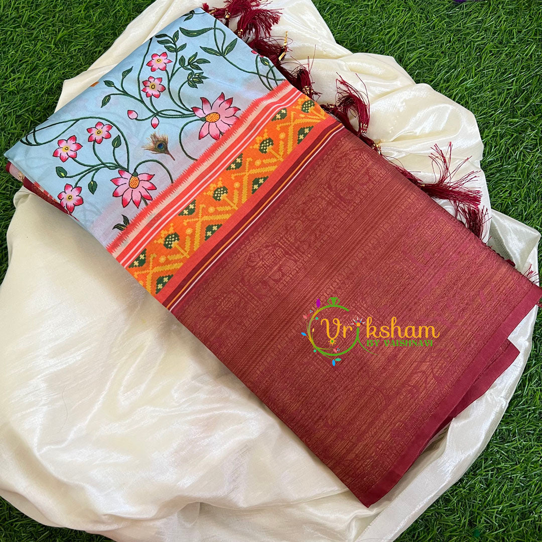 Sky Blue with Maroon Border Kalamkari Semi Soft Silk Saree – with traditional border – Kalamkari digital print pattern throughout the saree; comes with Blouse attached. Two side contrast traditional border and pallu.