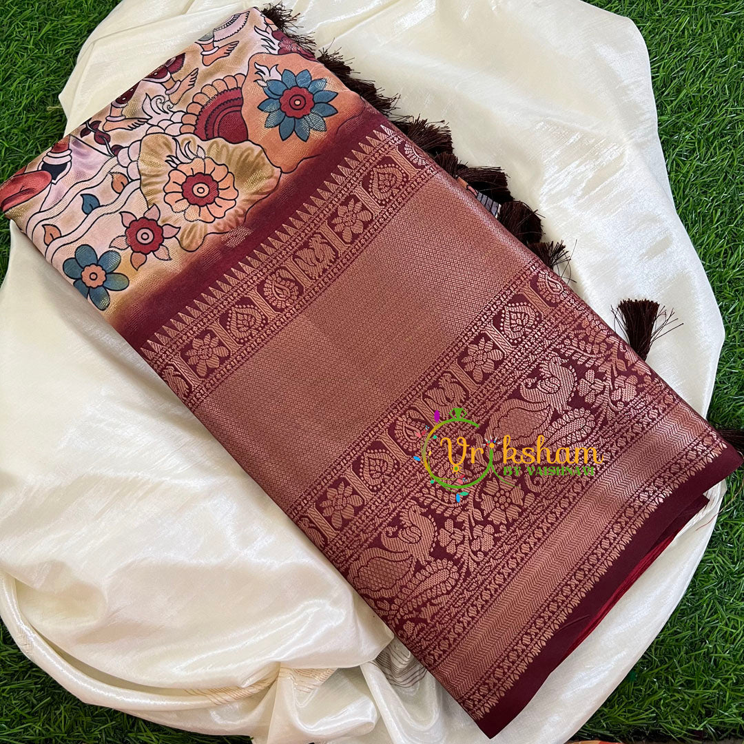 Beige Kalamkari Semi Soft Silk Saree – with traditional border – Kalamkari digital print pattern throughout the saree; comes with Blouse attached. Two side contrast traditional border and pallu.