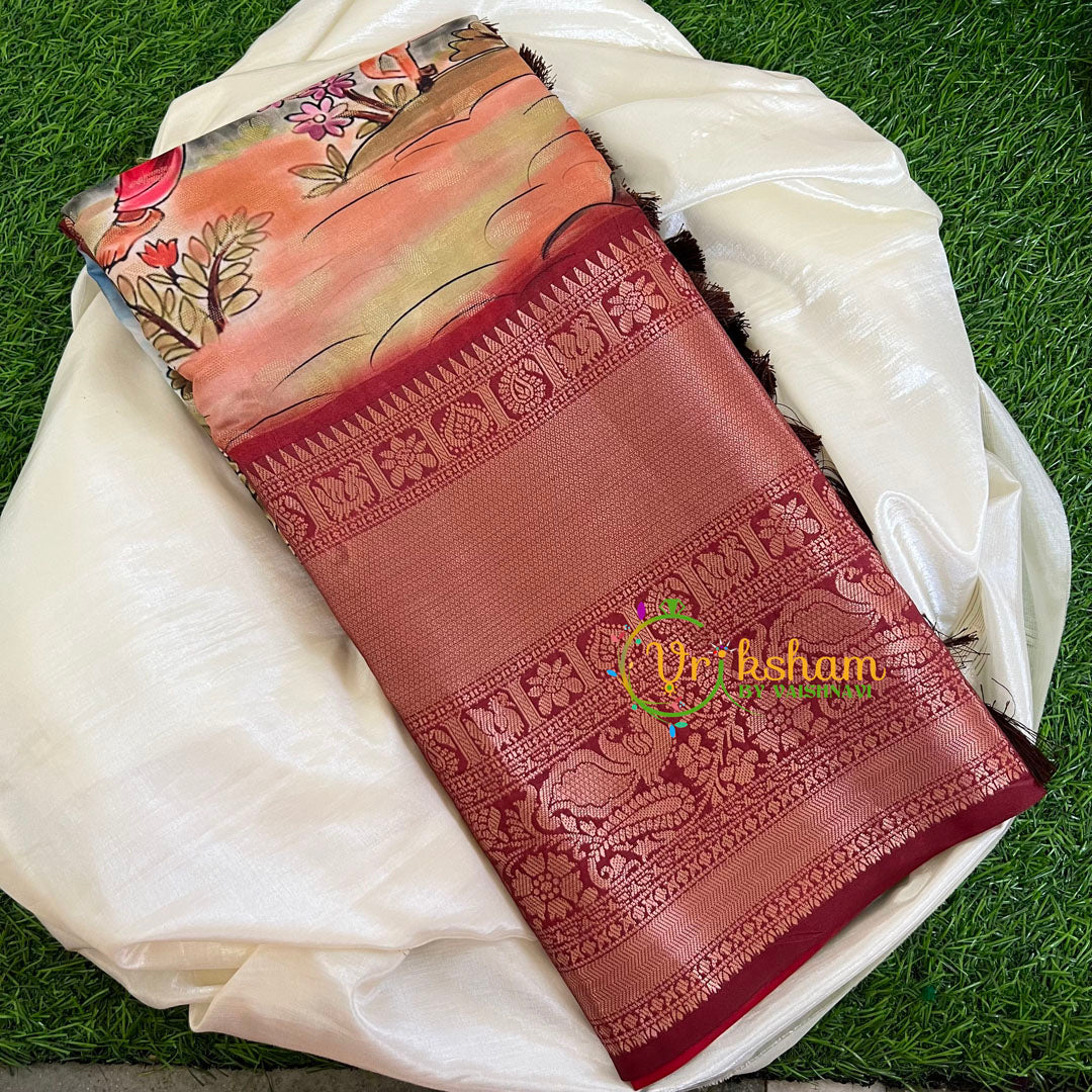 Peach and Maroon Border Kalamkari Semi Soft Silk Saree – with traditional border – Kalamkari digital print pattern throughout the saree; comes with Blouse attached. Two side contrast traditional border and pallu.