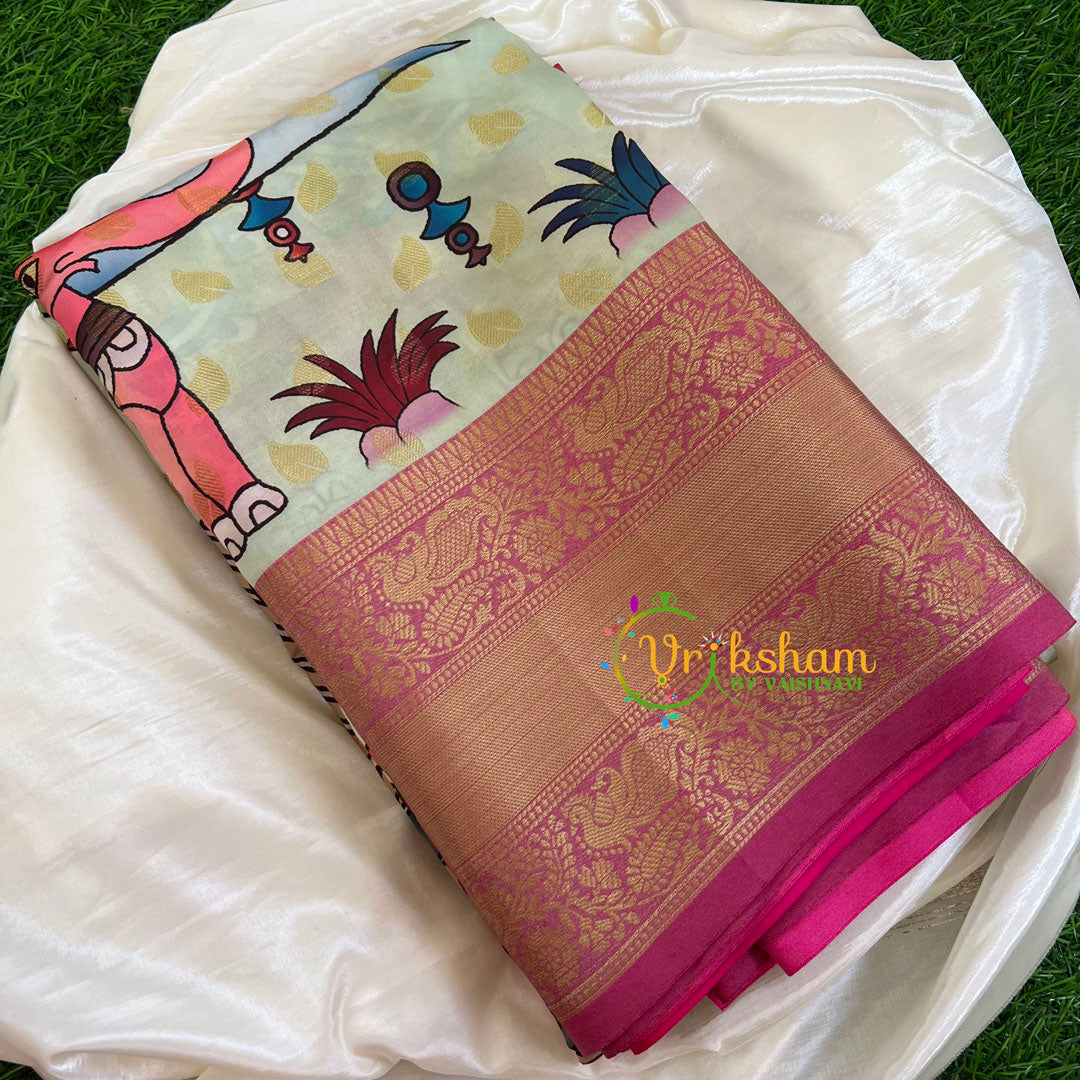 Light Teal Kalamkari Semi Soft Silk Saree – with traditional border – Kalamkari digital print pattern throughout the saree; comes with Blouse attached. Two side contrast border and pallu.