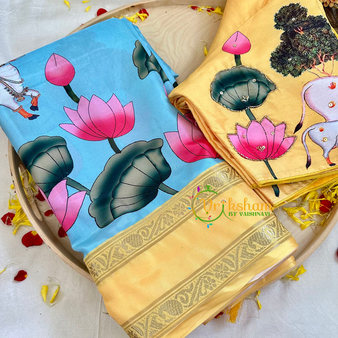 Kalamkari Soft Silk Saree– Festive wear saree –These incredible weaved semi gadwal silk sarees with Mina kalamkari print work throughout the saree. majestic contrast very big border and royal ombre kinda pallu.