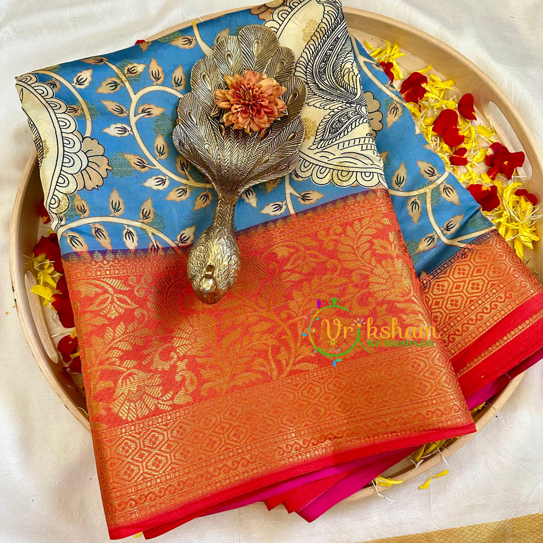 Kalamkari Saree – Festive wear saree –These incredible weaved gadwal semi silk sarees with Mina kalamkari print work throughout the saree. majestic contrast very big border and royal ombre kinda pallu.