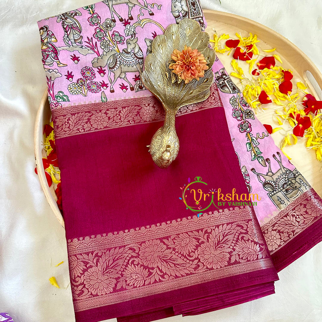 Kalamkari Saree – Festive wear saree –These incredible weaved gadwal semi silk sarees with Mina kalamkari print work throughout the saree. majestic contrast very big border and royal ombre kinda pallu.