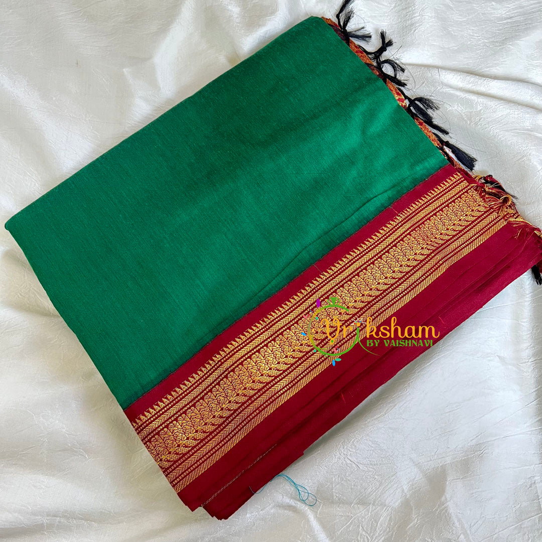 Green Saree with Maroon Border -Kalyani Cotton Saree - comes with Blouse attached. Contrast border saree. Poly mix cotton.