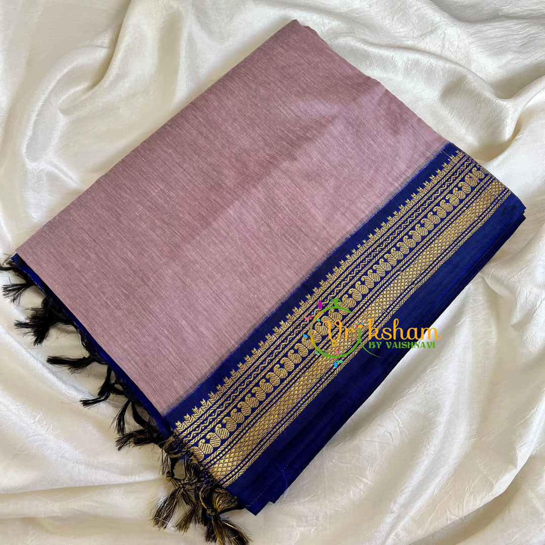 Onion Pink Saree with Blue Border -Kalyani Cotton Saree - comes with Blouse attached. Contrast border saree. Poly mix cotton.